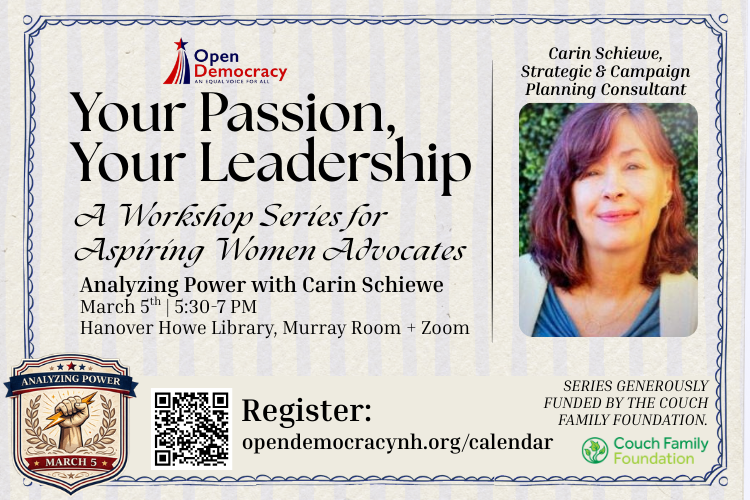 Your Passion, Your Leadership: A Workshop Series for Aspiring Women Advocates: In partnership with the League of Women Voters of New Hampshire, MomsRising, and other women-centered community organizations, this six-part workshop series will empower women in the Upper Valley to step into their power as leaders and advocates. Using the disproportionate impacts of HB 1569 on women’s right to vote as a central case study, the series will provide participants with the tools, skills, and confidence necessary to engage in effective advocacy. From understanding how power operates on a day-to-day basis in our communities, to mastering communications and social media, to managing volunteers and sharing success stories, each session is designed to strengthen women’s voices and build a more representative democracy.
