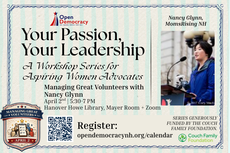 Your Passion, Your Leadership: A Workshop Series for Aspiring Women Advocates: In partnership with the League of Women Voters of New Hampshire, MomsRising, and other women-centered community organizations, this six-part workshop series will empower women in the Upper Valley to step into their power as leaders and advocates. Using the disproportionate impacts of HB 1569 on women’s right to vote as a central case study, the series will provide participants with the tools, skills, and confidence necessary to engage in effective advocacy. From understanding how power operates on a day-to-day basis in our communities, to mastering communications and social media, to managing volunteers and sharing success stories, each session is designed to strengthen women’s voices and build a more representative democracy.