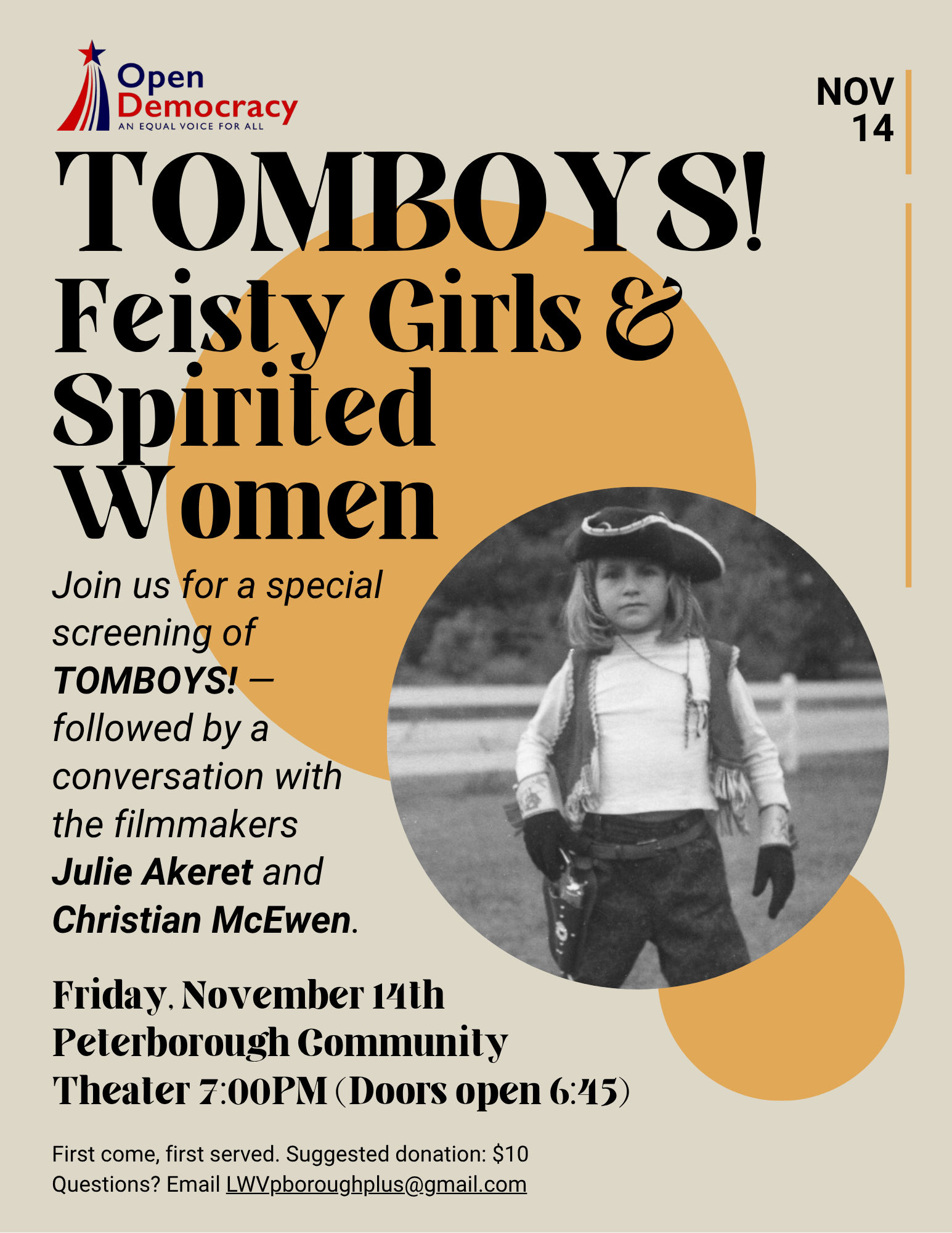 Peterborough Plus unit of League of Women Voters and co-sponsor Open Democracy invite you to a screening of Tomboys! Feisty Girls and Spirited Women.In this lively, inspiring short documentary, interviews with African-American teenager, Jay Gillespie; firefighter, Tracy Driscoll: lesbian artist, Nancy Brooks Brody; and political activist “Granny D.,” are intercut with personal photographs and archival footage to celebrate tomboys of all ages.